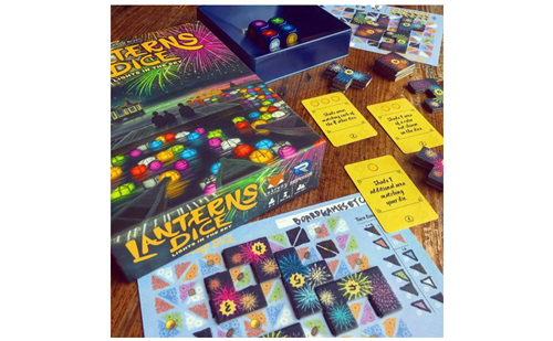 Incluye: 1 block de hojas de puntuación, 3 cartas de emperador, 48 losetas de fuegos artificiales, 4 dados de linterna, 1 bandeja de dados.
