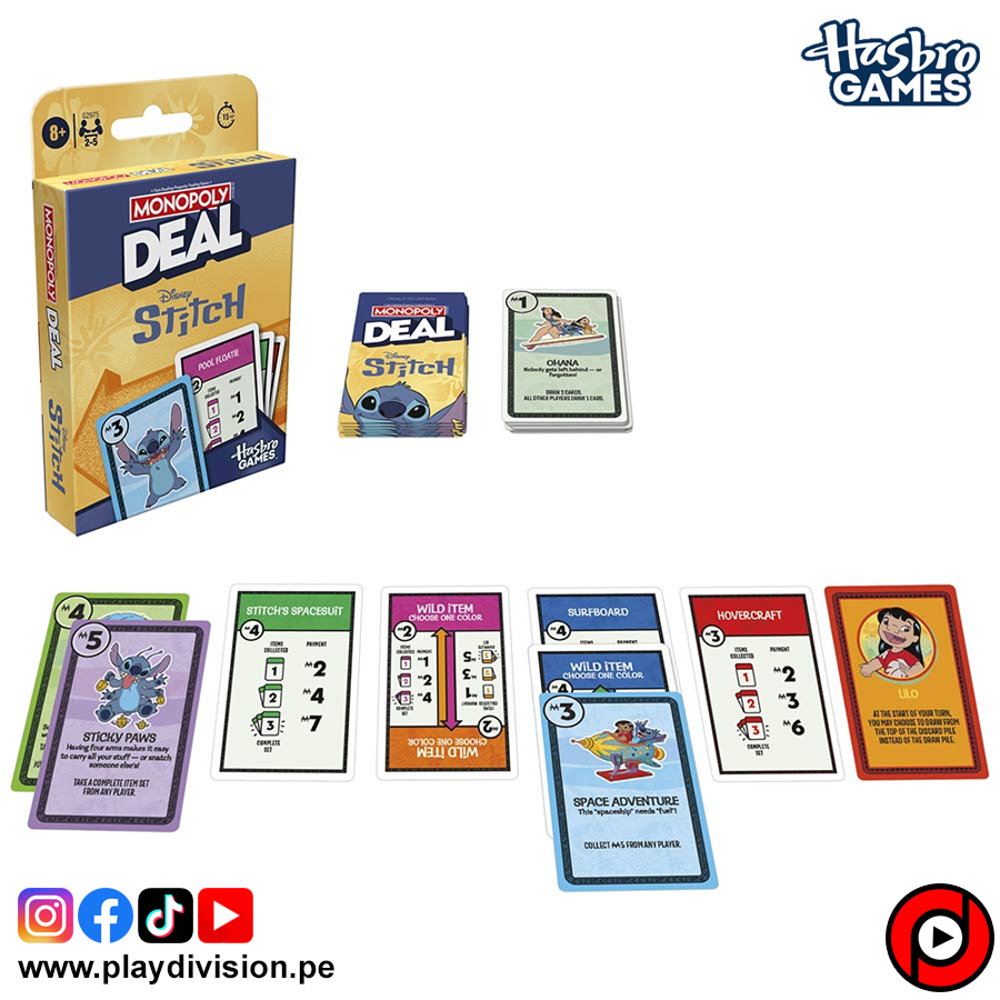 Monopoly Deal: Stitch es una versión temática del juego de cartas Monopoly Deal inspirada en el personaje Stitch (de Lilo & Stitch). En este juego rápido y dinámico, los jugadores compiten por coleccionar conjuntos de propiedades temáticas, usar cartas de acción y dinero para retrasar a sus oponentes, y ser el primero en reunir tres conjuntos completos. Ideal para familias y fans de Stitch, ofrece partidas cortas llenas de interacción y diversión.